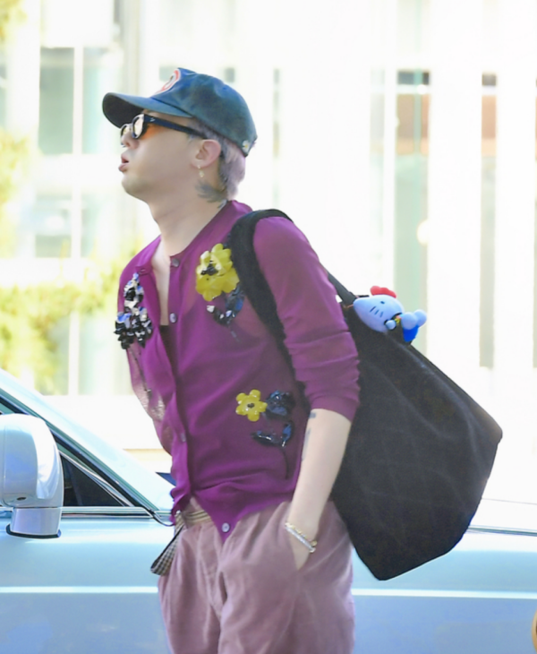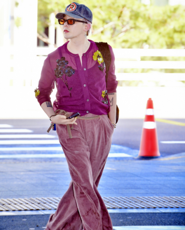 全场焦点:那件Miu Miu“古着”开衫现在,让我们把目光聚焦到这件紫色的针织开衫上。这件衣服可不是什么新款,而是好几季之前的 Miu Miu 男款。在时尚圈,过季就等于“退役”,但在GD身上,这件衣服仿佛获得了第二次生命。 大胆的紫色,配上黑色的立体花卉刺绣,既复古又带点妖娆。GD用它来搭配粉色丝绒裤,这种高难度的撞色组合,被他穿出了无与伦比的和谐感。这告诉我们一个道理:真正的时尚,无关新旧,只关乎审美和搭配。