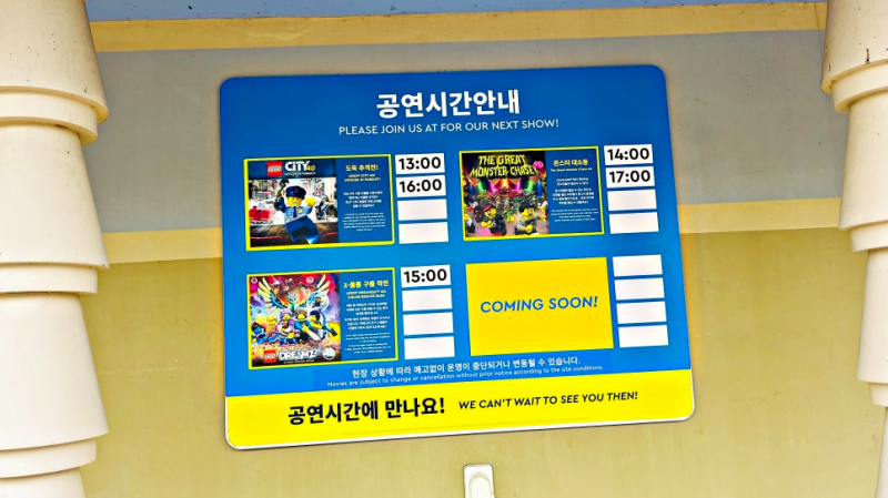 园区里的餐厅在饭点的时候人会特别多,排队是难免的。建议大家可以稍微错峰吃饭,比如上午11点半或者下午1点半之后,这样可以节省不少时间。 🎯 韩国乐高乐园一日游精华总结入园先看好演出时间表,规划好游玩路线。